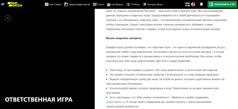 Одно из направлений Parimatch Ukraine - принципы ответственной игры. Компания пропагандирует эти принципы и подчеркивает, что азартные игры – это в первую очередь развлечение. В разделе собраны советы и правила, чтобы игра дарила только положительные эмоции от спортивных побед и рекордов.